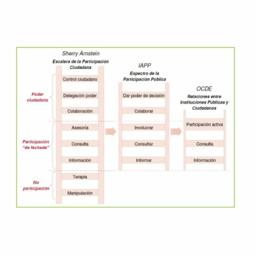 En términos generales, la participación ciudadana consta de cinco niveles: información, consulta, implicación, colaboración y empoderamiento. Cada uno de estos niveles requiere herramientas específicas: